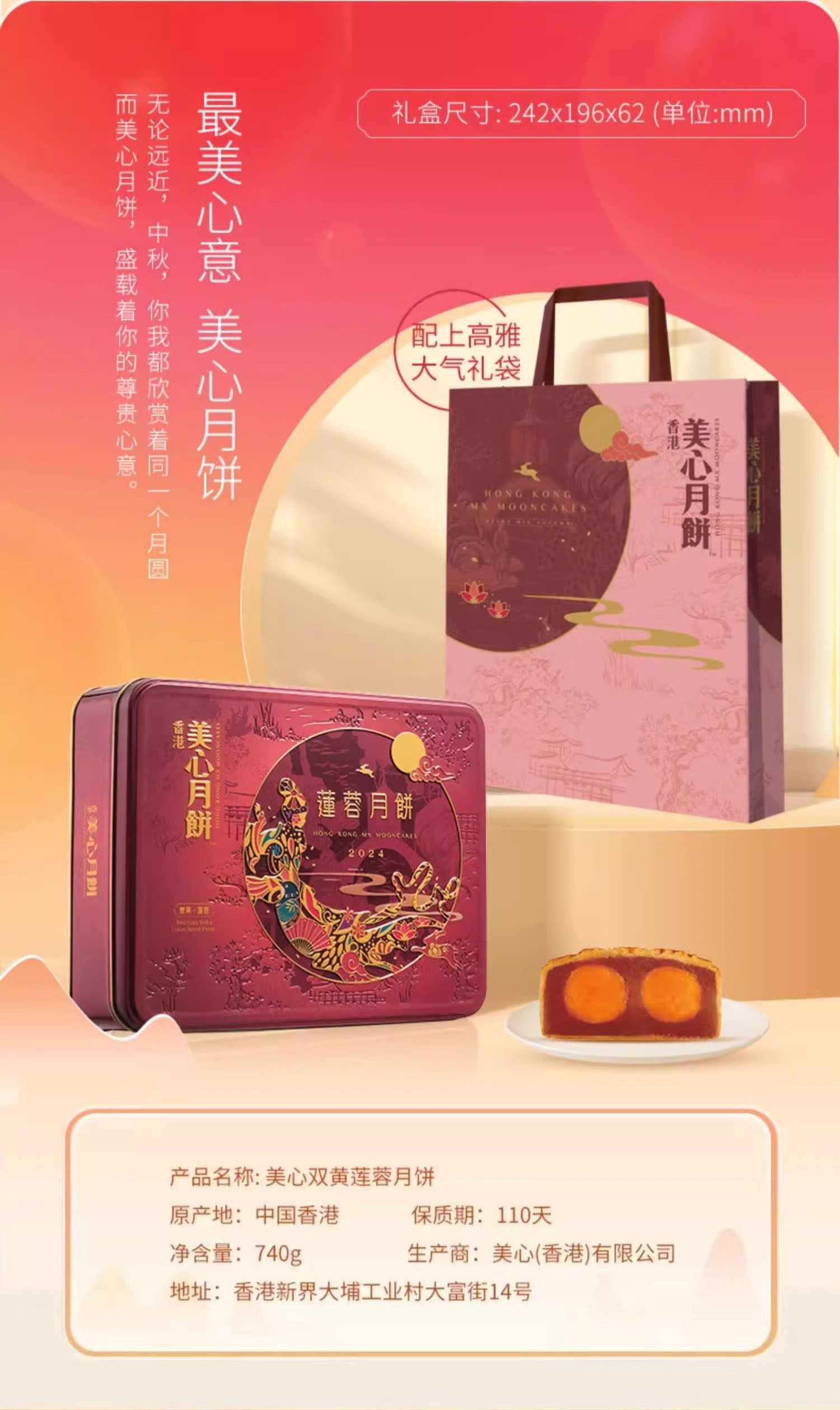 香港美心月饼 双黄豆沙月饼 团购价格另询